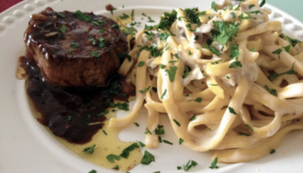 (SPAGUETTI AO MOLHO BRANCO, FILÉ MIGNON MEDALHÃO)