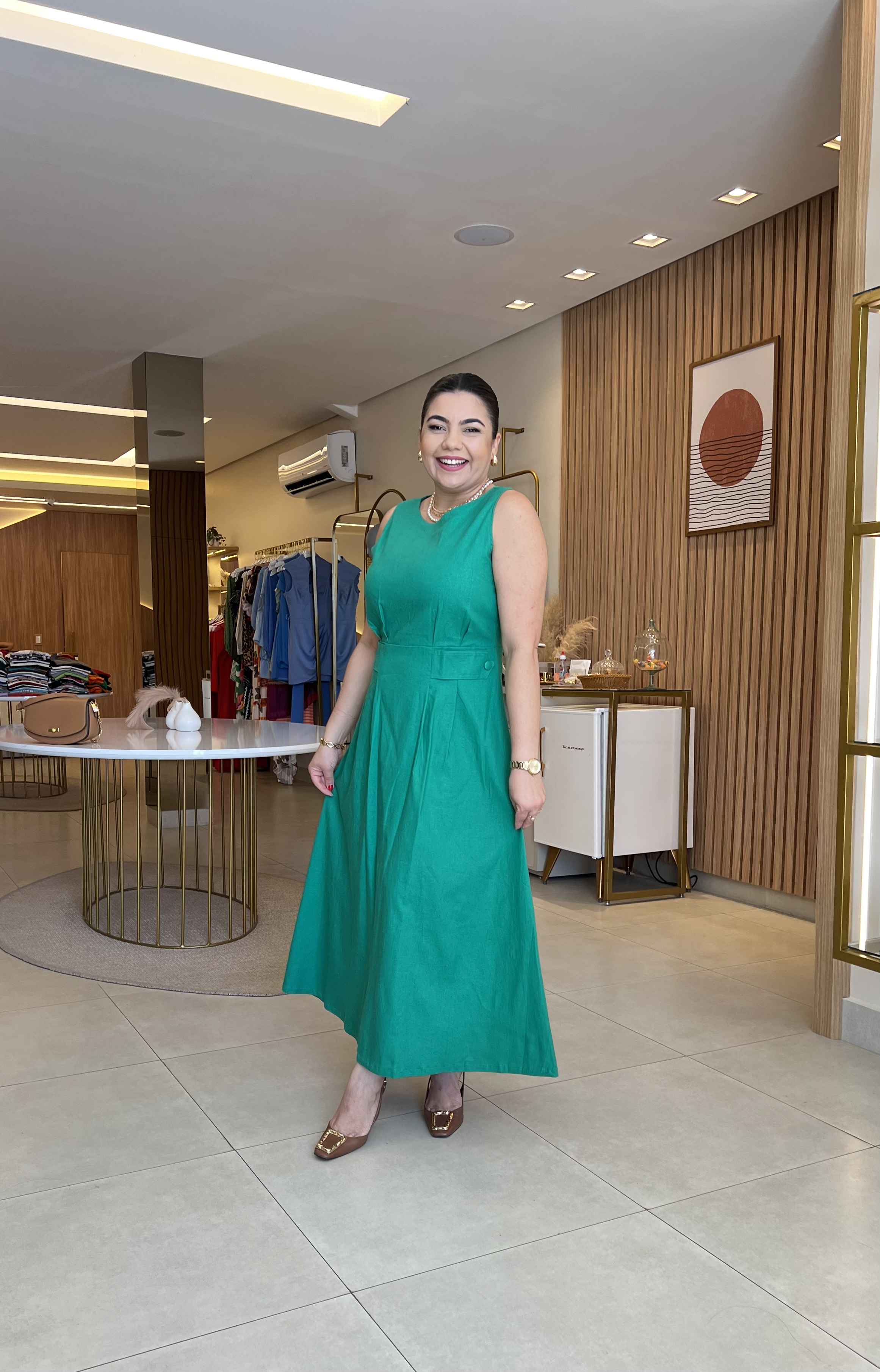 Este vestido apresenta um corte clássico e sofisticado. Ajustado na parte superior para realçar a silhueta, ele se amplia suavemente a partir da cintura, criando um elegante efeito evasê em linho. Disponível nos tamanhos P, M e G.